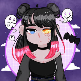 Full color. Chibi style icon with a geometric background.